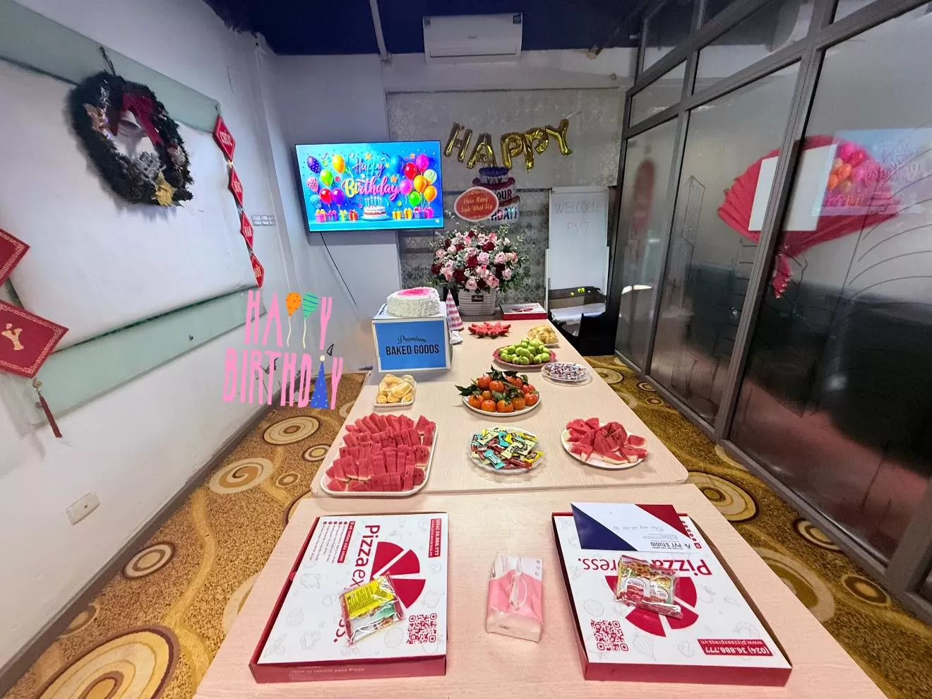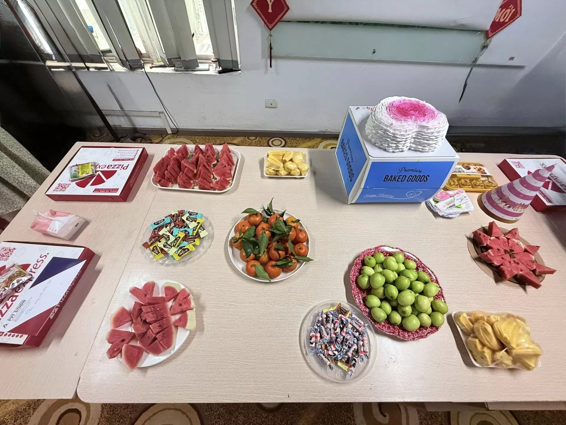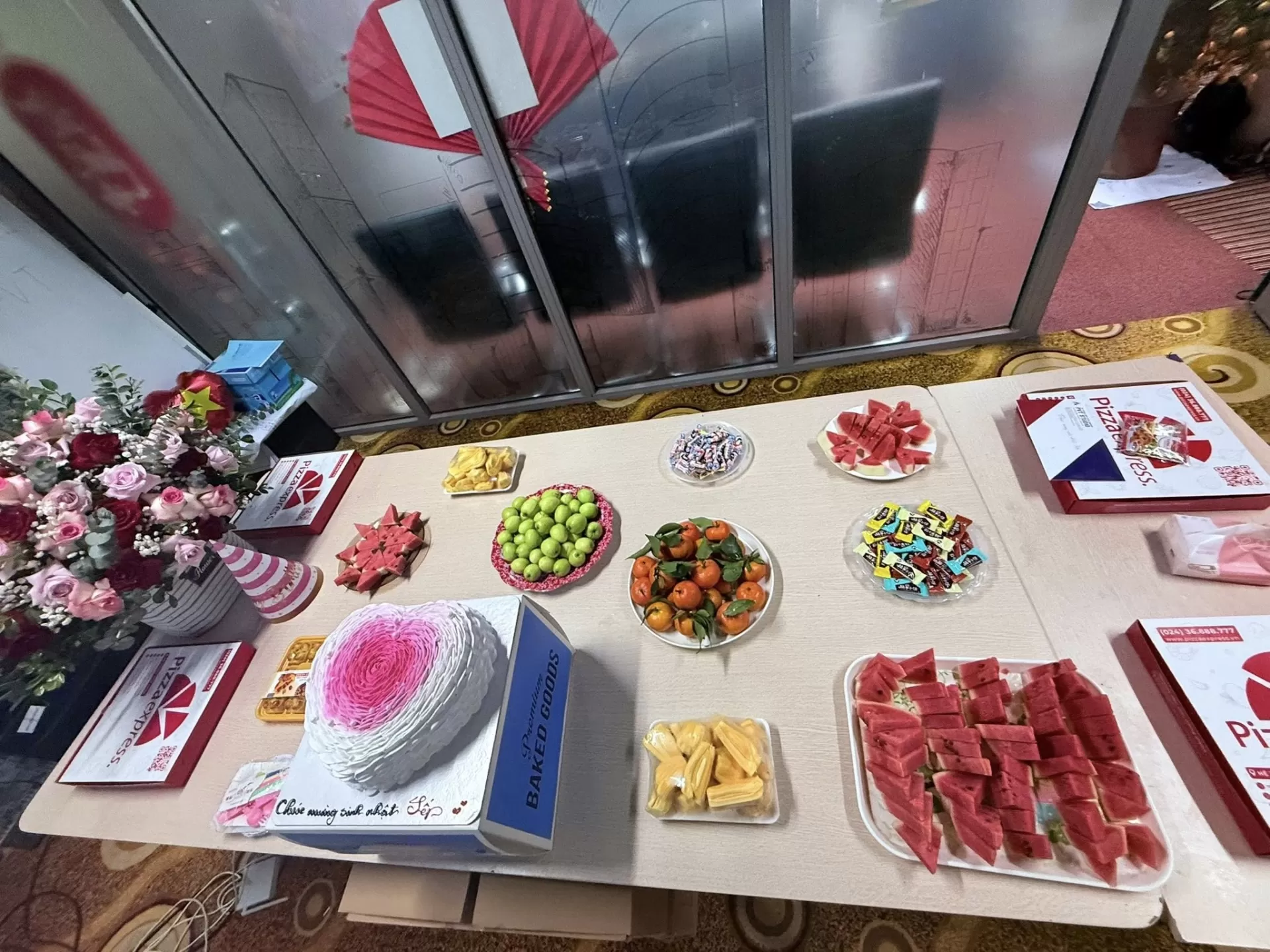 Không gian buổi tiệc được chuẩn bị chu đáo với bánh kem tạo hình trái tim nổi bật, hoa tươi cùng bàn tiệc ngọt giản dị nhưng đầy đủ và ấm áp. Từ những chiếc bánh pizza, trái cây tươi cho đến những món ăn nhẹ, tất cả đều được sắp xếp tinh tế, tạo nên một không khí thân mật, gần gũi. Dòng chữ “Happy Birthday” cùng những lời chúc mừng sinh nhật ý nghĩa đã góp phần làm cho khoảnh khắc thêm phần đáng nhớ.